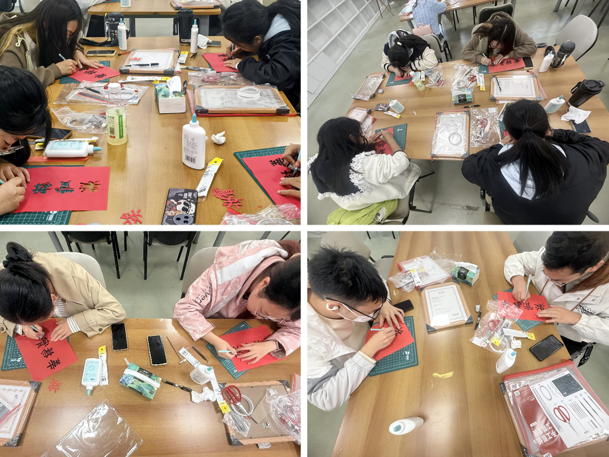 进入实践环节,同学们迫不及待地拿起提前准备好的刻刀、垫板,以印有交大精神“竢实扬华”字样的模板为参照,沉浸式投入创作。大家屏息凝神,专注调整刻刀角度,细致处理笔画转折处的细微纹路,遇到技巧难题时便相互交流探讨。杨宏毅则穿梭在学生之间,逐一观察大家的操作手法,及时纠正错误姿势,针对“刻刀卡顿”“纹样变形”等常见问题现场示范,耐心解答每一个疑问,让学子们在实践中不断改进技巧。随着时间推移,一张张红纸在刻刀下逐渐褪去多余部分,“竢实扬华”四个苍劲有力的大字慢慢浮现,原本普通的红纸瞬间变得富有生命力,成就感与自豪感在每位学子的脸上绽放。