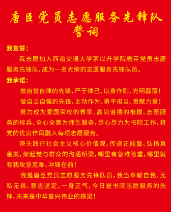 唐臣党员志愿服务先锋队队员不仅意味着光荣的名号,更意味着无私地奉献。希望全体队员如誓词中那般,努力成为同学们的表率,全心全意为师生服务、尽心尽力为书院工作,在生活中传递正能量,将党的优良作风融入每项志愿服务。