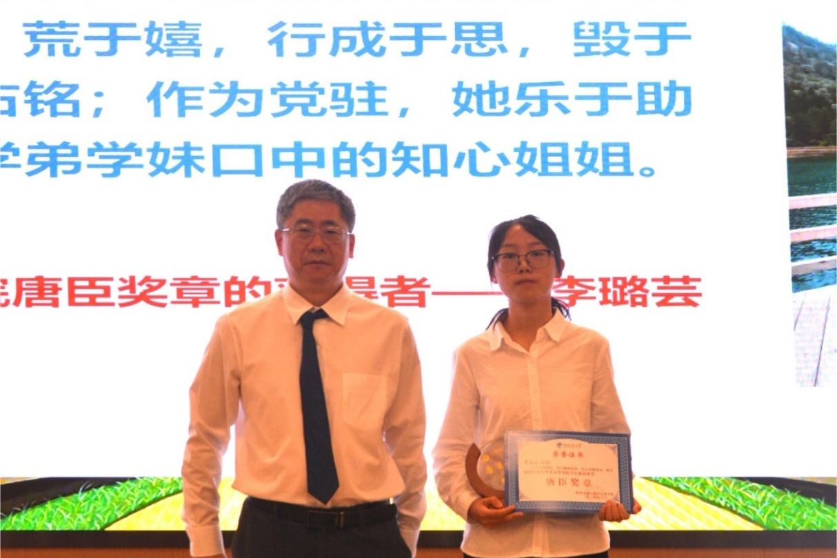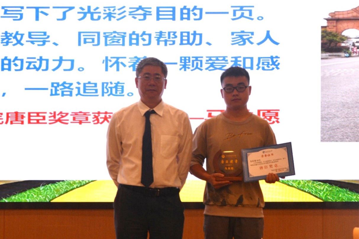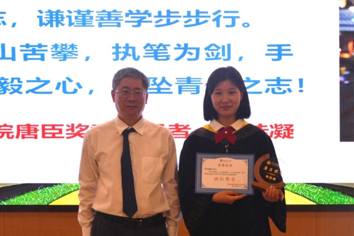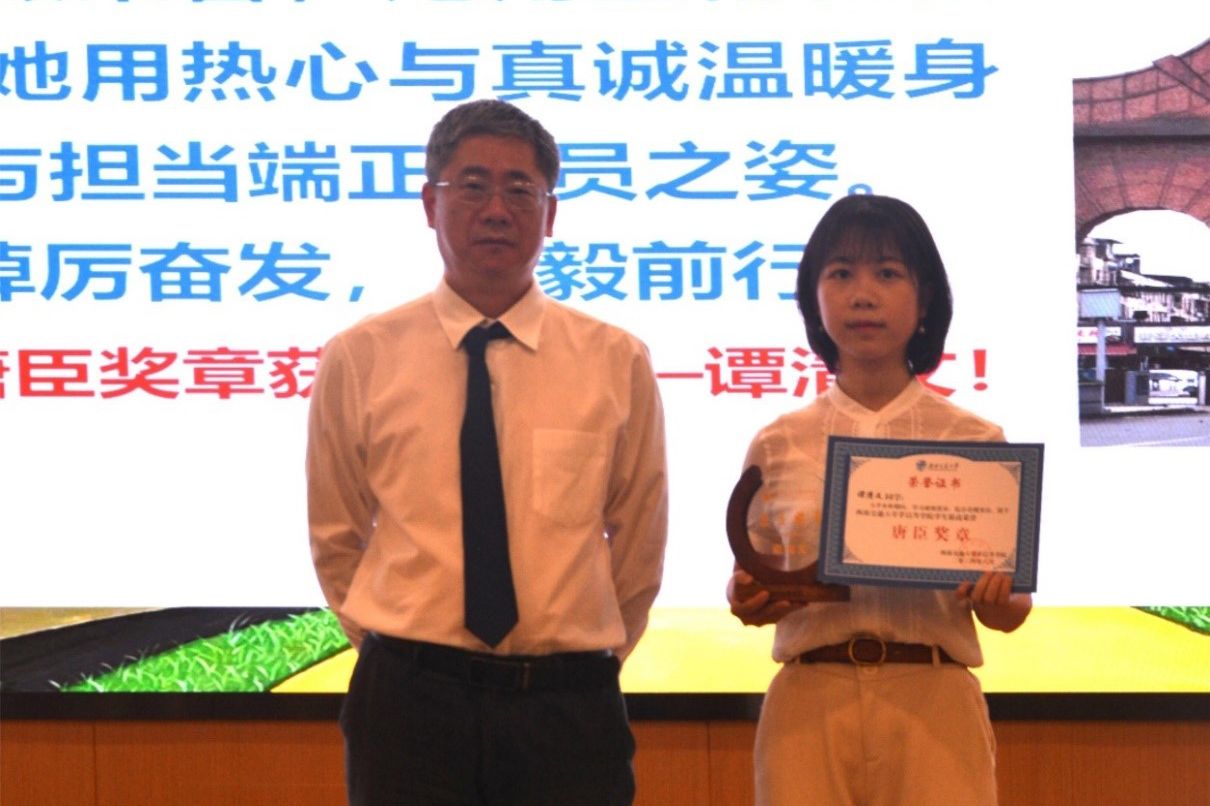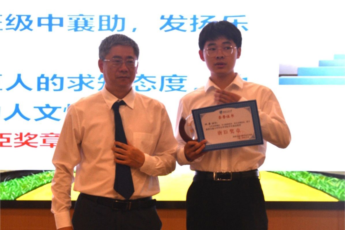 接下来,进入毕业荣誉典礼的表彰环节。校长助理、教务处处长、欧美A片 常务副院长崔凯宣读学院2024届学生最高荣誉“唐臣奖章”表彰文件,并由康国政院长对7位获得唐臣奖章的毕业生颁发奖杯及证书。