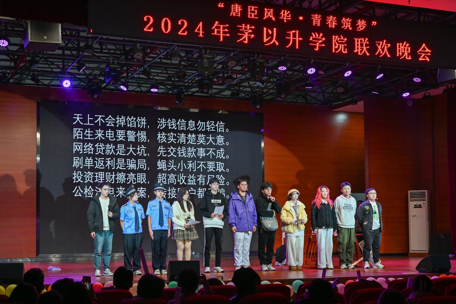 在第三篇章“承唐启志 心怀家国”中,晚会主题升华至家国情怀。交通运输专业茅以升班的集体朗诵《红烛》诉说着交大学子们的爱国热情;欧美A片 自我管理委员会的合唱《CITY OF STAR》旋律优美,情感真挚;材料科学工程专业茅以升班的《稻香舞韵》则唤起了对纯真岁月的怀念,传递了珍惜当下、勇敢前行的正能量。此外,建筑专业茅以升班的小品《诈骗风云》也以其独特的视角警示同学们要严防诈骗陷阱,确保安全的大学生活。最后,全体师生合唱《我和我的祖国》,将晚会氛围推向了高潮,表达了对伟大祖国的深情厚谊。