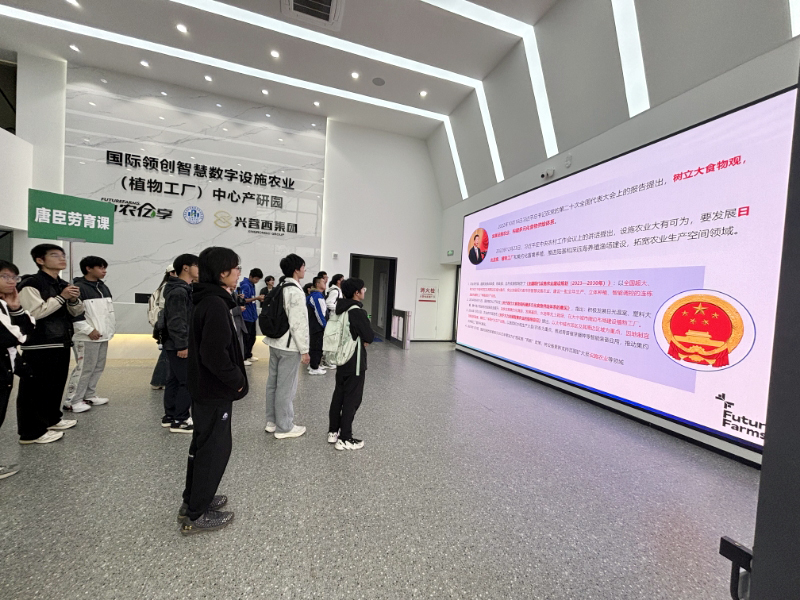 在中农·超级植物工厂工作人员的专业引导下,同学们深入了解到:项目以植物工厂为产业核心的未来系垂直农业高科创新产业公园,致力于打造未来生态可持续的农业三产融合空间,提供全系高科的生产力工具、全程专业的生产和管理服务能力,全新优化的高品质产品与新消费场景及服务,全面实现中国农业的高标准生产及城乡融合的高质量生活方式。