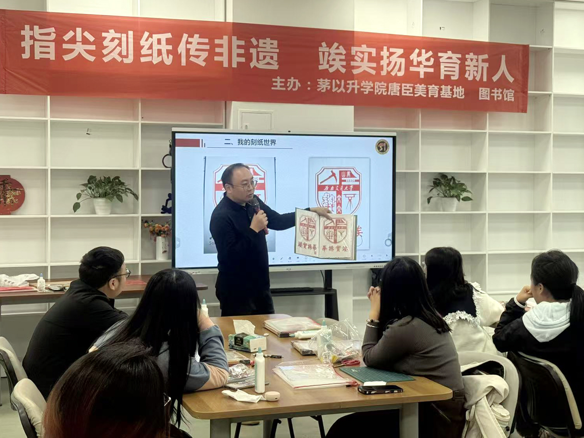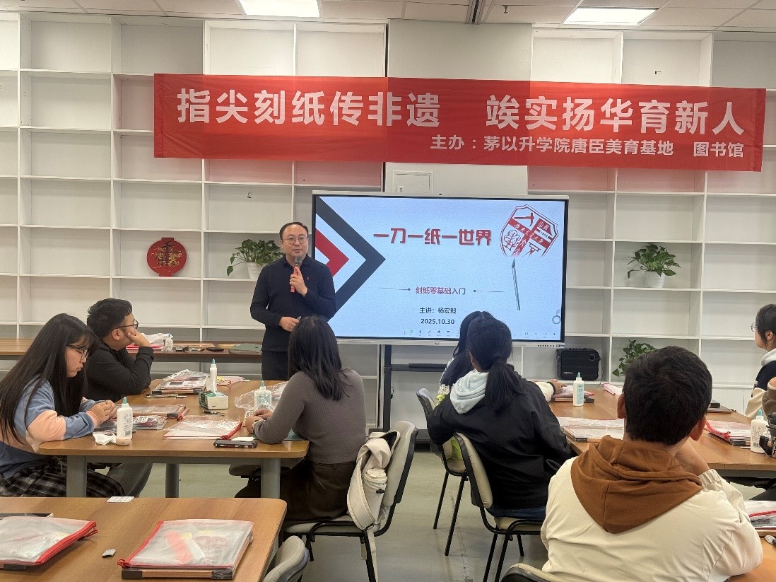联合图书馆在犀浦校区图书馆TA615多功能活动室共同举办了“指尖刻纸传非遗,竢实扬华育新人”唐臣美育主题活动。