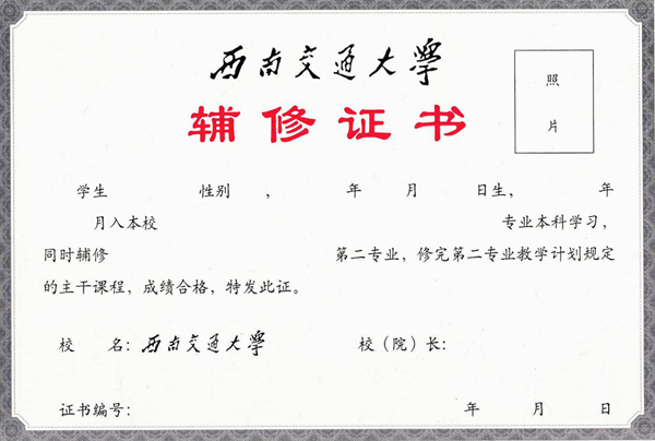 根据《普通高等学校学生管理规定》第十五条、第三十七条,学生完成辅修专业培养方案,颁发辅修专业证书,证书样本如下: