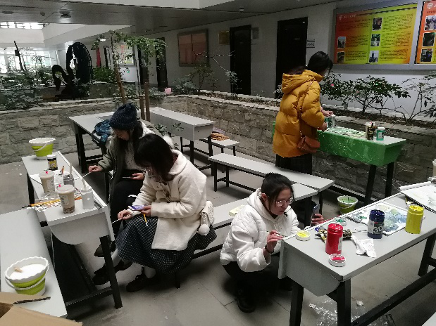 2018年12月9日下午1点,新的一批志愿者带着一精心准备的草图对庭院中的部分桌椅进行了美化的工作,将以“春夏秋冬”为主题的彩绘装饰在桌子的背面,给来到这里的同学以清新的感受。