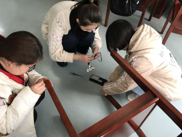本次活动共分为两次完成,分别在11月27日和12月7日。在活动中,金融、中文团支部全员出动,每人备好活动所需的工具和消音所需的材料,进入图书馆后立刻按照团小组分工区域,井然有序、有条不紊地开始了本次公益活动。经过现场勘查,图书馆的椅子下方原有用钉子钉住的塑料消声垫,但由于年代久远和经常摩擦,原先的塑料消音垫不仅失去了效果,而且在拖动时会制造出更大的噪音。同学们采用各种办法,先把旧的塑料垫取下,再粘上新买的摩擦垫。每组成员分工明确、合作默契,并在活动的进行过程中总结经验,从而提高了工作的效率和质量,受伤的情况也很大程度上减少。同学们的工作态度认真严谨,在每次实践结束后都主动将垃圾收拾干净、座椅摆放整齐。