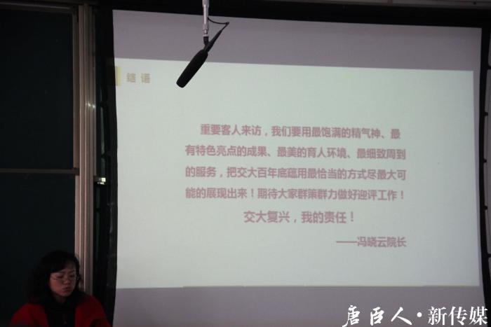 院长冯晓云教授的话为同学们加油打气:“重要客人来访,我们要用最饱满的精气神、最有特色和亮点的成果、最美的育人环境、最细致周到的服务,把交大百年底蕴用最恰当的方式尽最大可能地展现出来。期待大家群策群力做好迎评工作。交大复兴,我的责任!”