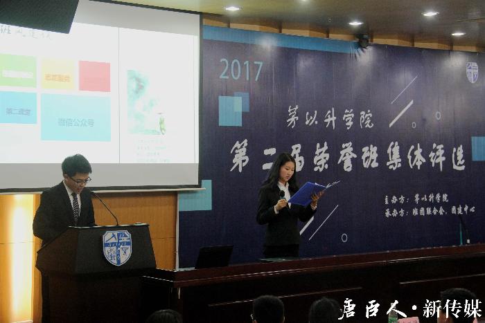 茅院(材料)2016-01班最先上台,他们用一段视频展现了班级风貌,随后从班徽与班服、学分与成绩、软实力指标、班团一体化建设等方面介绍了他们在班级建设上所取得的成就。并详细介绍了班级实践活动,充分体现了学以致用的重要性。