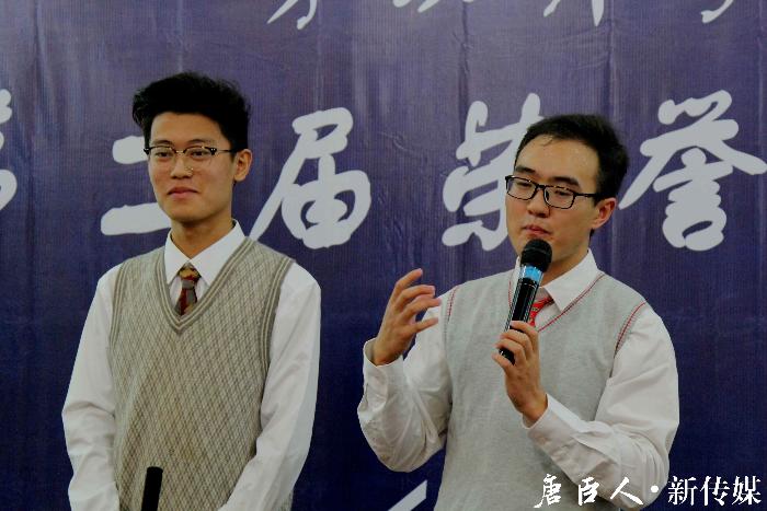 茅院(土木)2015-01班马嘉霈上台,他通过一段视频表现出了15茅土每位同学的风貌。就学习成果、文体实践活动、班级文化系统地介绍了几年来班集体融洽、和谐的学习氛围。他展示了班集体获得的各式各样的证书以及班集体举办的各式各样的活动。他们大声宣告:“茅土崛起!”