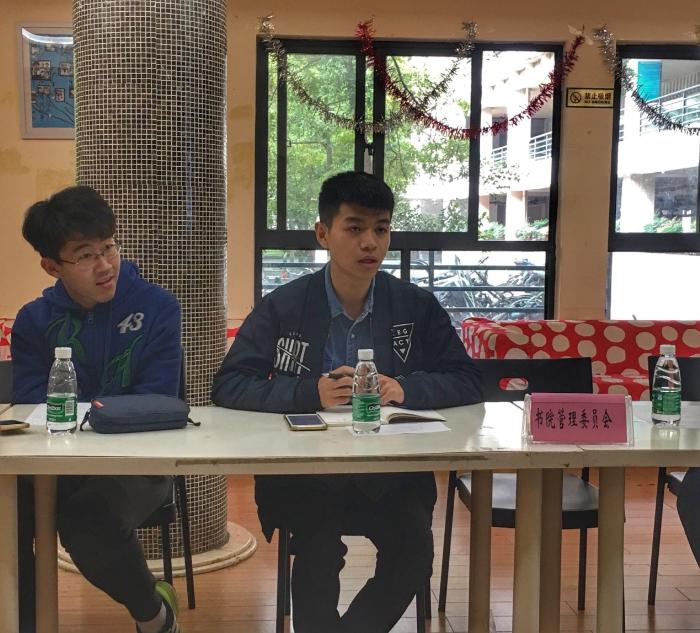 书院管理委员会上月举办了“橙读品鉴日系列活动之品茶听书”活动,在书院一楼的电视机上新推出了“唐臣志”栏目。下阶段,书管会将举办“寝室装潢大赛决赛”、“特色寝室评比”、“橙读品鉴日系列活动之模拟炒股大赛”等特色活动。主席陆禹佳提醒大家一定要注意活动经费报销的规范化问题。