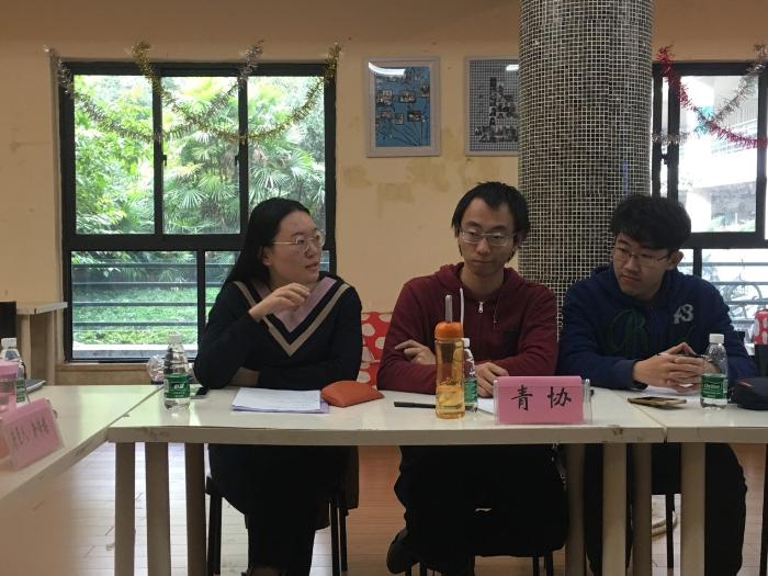 青年志愿者协会上月举办了“交通公益比赛”、“朝阳系夕阳·晚霞养老院志愿服务”、“大田小学PS教学”、“校园雕塑清洁”等活动,与图书馆合办了“孔子诞辰日系列活动”。接下来青协将会与图书馆合办“叩响异国之门”特色活动,与留学生联谊。副主席张赫提出,各组织举办的活动存在着时间交叠、特色不鲜明的问题,希望与大家磋商、解决。