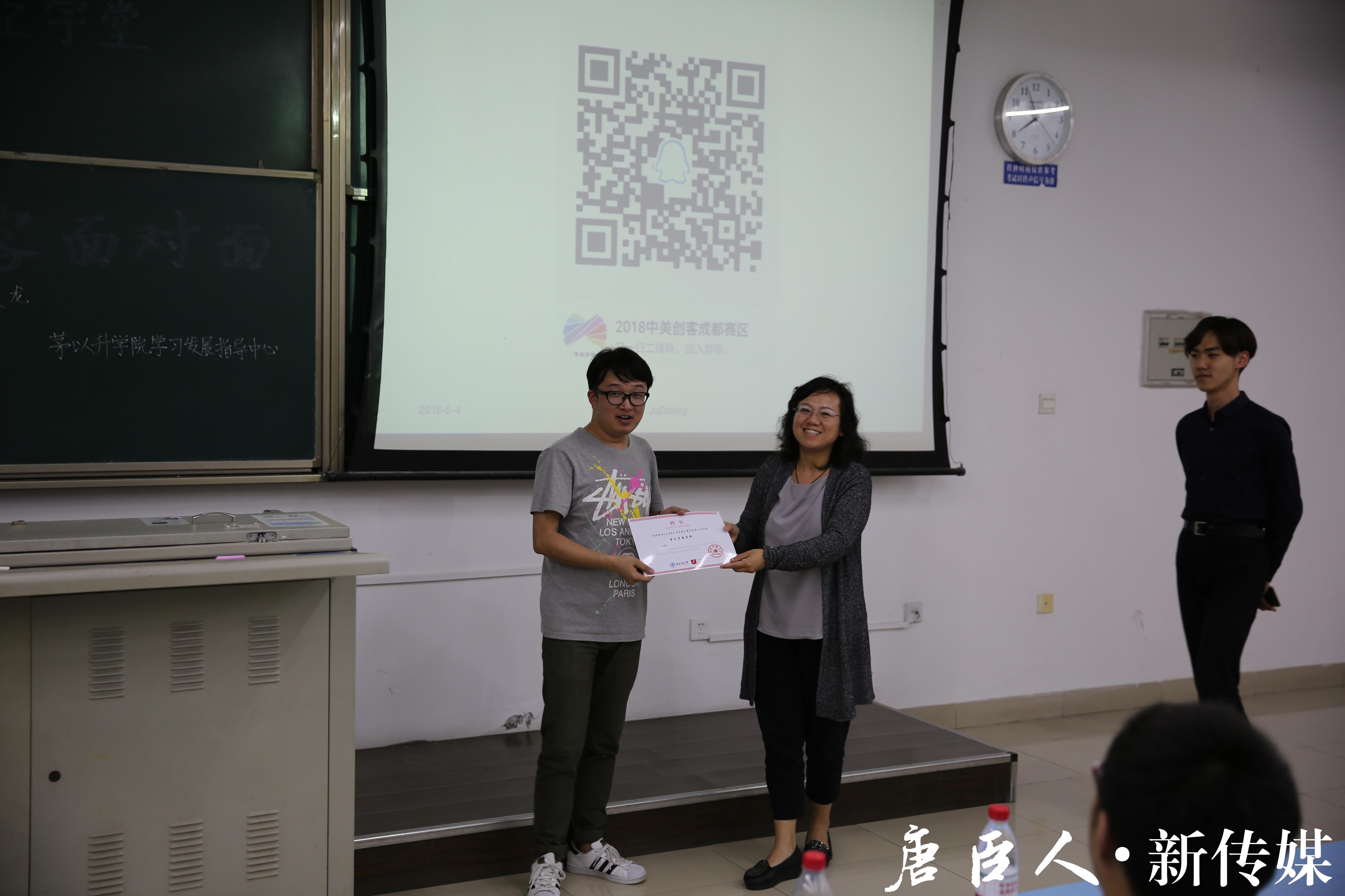 最后,我院党总支副书记、学生工作组组长王霞老师向主讲人鞠大龙董事颁发了“唐臣学堂导师”的荣誉聘书。至此,第二十三期唐臣学堂“中美创客面对面”宣讲会圆满落幕。愿即将到来的2018年中美青年创客大赛成都分赛区选拔赛顺利举行,也预祝各位参赛同学取得佳绩。