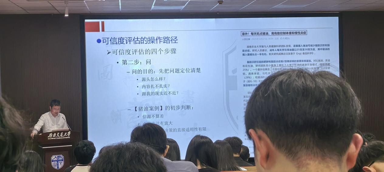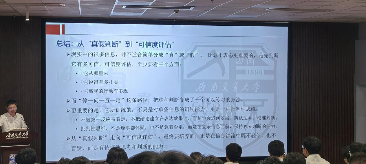 最让我感触的是老师讲述的“停—问—查—定”的路径。此前面对诸如“猪油控体重”这类热点信息,我总是为了求证其可信度百思不得其解。这套方法则让我有了清晰的应对思路。“停”是暂停即时反应,避免被情绪或表象裹挟;“问”是主动质疑,探究信息的来源、依据和适用边界;“查”是多方查证,对比不同信源,追溯原始依据;“定”是基于证据做出个人的可信度判断与行动选择。这个过程让我认识到,理性不是天生的直觉,而是一套可以训练、可以遵循的思维程序。正如统计推断需要遵循严格的步骤一样,面对日常信息,我们也需要这样的“思维操作指南”,才能避免认知偏差,做出更可靠的判断。