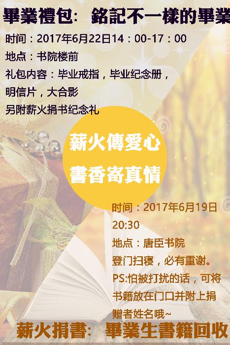 青协承办的“薪火传爱心·书香寄真情”毕业季捐书活动及毕业礼包领取活动将于近期开展。现将本次活动相关事宜告知如下: