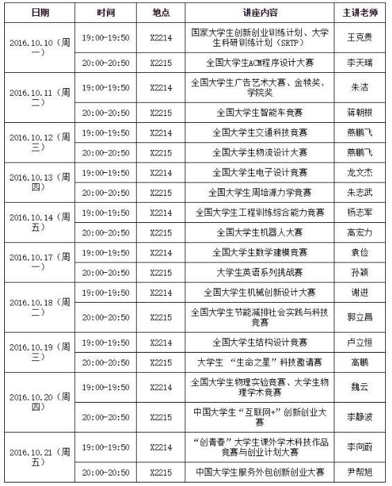 教务处主办、西南交大创新创业俱乐部承办的 2016—2017学年第一学期学科竞赛及创新创业活动讲座活动于10月10日—21日举行。
