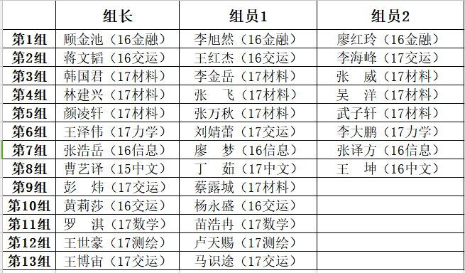 根据报名情况,本次计划暂不对排名位于后30%的同学作规定,优先考虑自愿报名的同学,现将本季组队情况公告如下,希望以下同学能够在学习生活中互帮互助,共同成长。