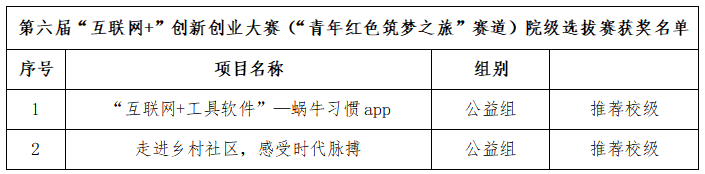 第六届“互联网+”创新创业大赛院级选拔赛获奖名单公示做如下公示: