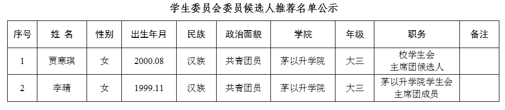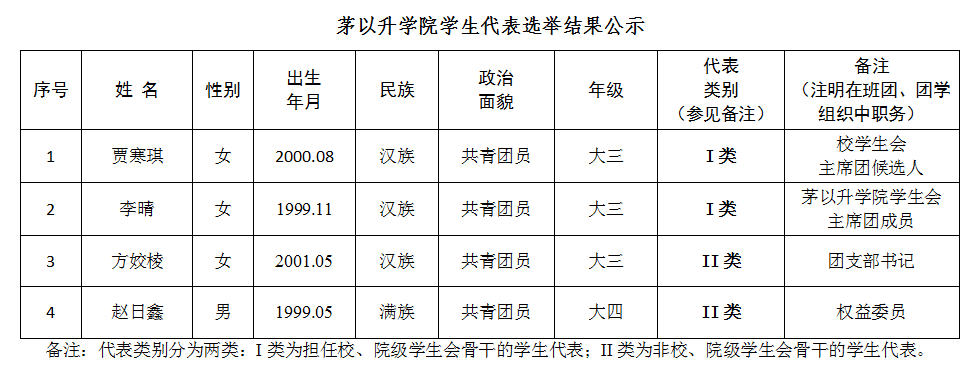 第三十次学生代表大会筹备工作的预通知》相关规定及学院代表名额分配要求,经班级(团支部)推荐、学院学生会组织召开学生的代表会议选举,共选举出学生代表4名;由学院团组织提名、经班级(团支部)推荐、学院团组织考察,推选出学生委员会委员候选人2名。现将代表选举结果、委员候选人推荐名单公示如下。