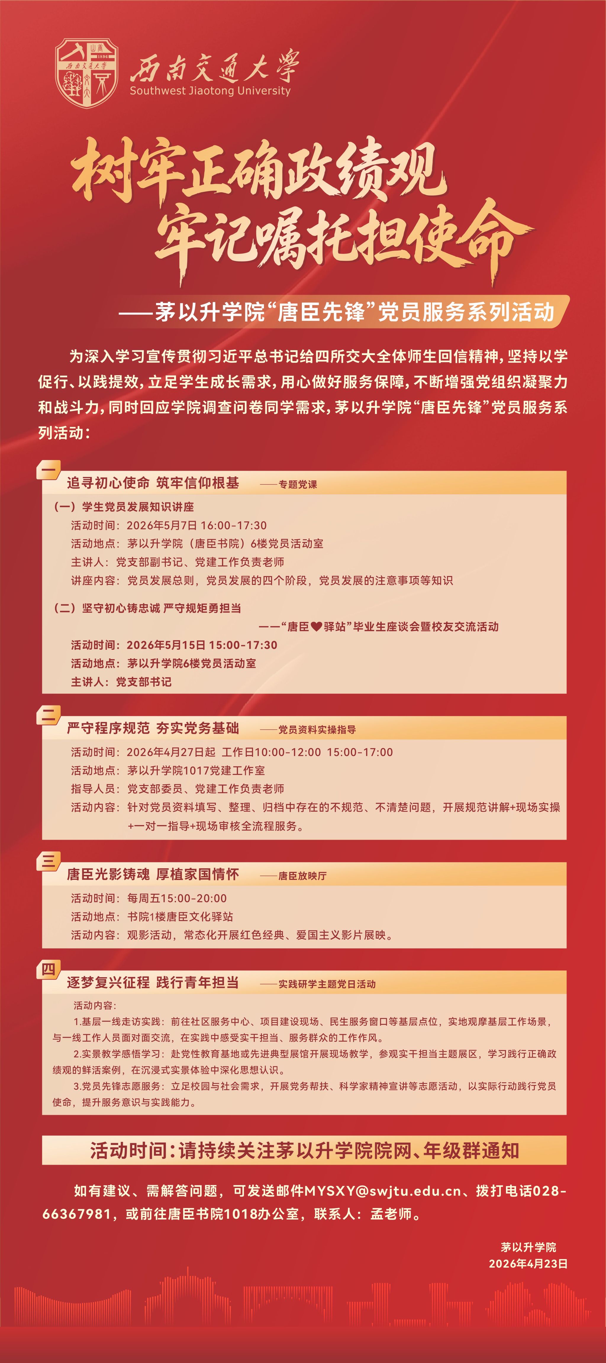 为深入学习宣传贯彻习近平总书记给四所交大全体师生回信精神,坚持以学促行、以践提效,立足学生成长需求,用心做好服务保障,不断增强党组织凝聚力和战斗力,同时回应学院调查问卷同学需求,欧美A片 特开展“唐臣先锋”党员服务系列活动: