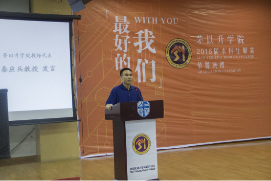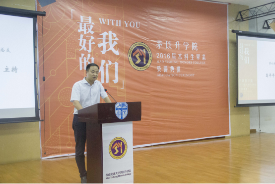 2012级“最奇葩”“最牛”“最爱自拍”同学的照片逐一出现,台下顿时热热闹闹地,满是欢声笑语,当各班的集体照缓缓闪过,典礼现场倏地安静了下来,同学们或沉思,或微笑,都回忆着过往的种种。随后,2015唐立新优秀教师奖获得者——秦应兵老师应邀发言,赢得掌声连连。毕业生代表,来自2012级茅信的时任学生会主席——王萌抒发了他的交大情怀,满含深情地讲述了从进入欧美A片
