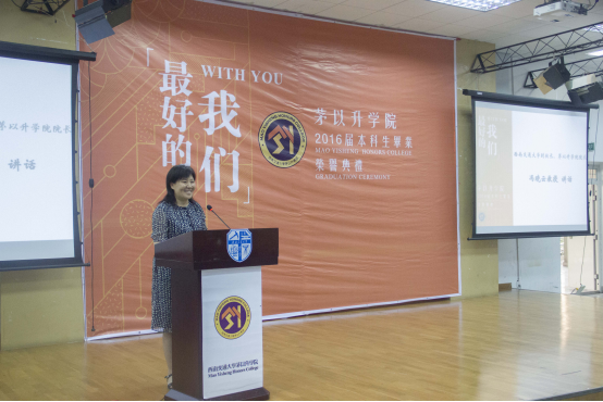院长冯晓云教授发表讲话,首先,她欣喜地例举了一组组的数据,肯定2012级唐臣学子取得的傲人佳绩,同时,也对毕业生们的人生规划提出了宝贵的建议,希望即将步入社会的同学们能够正确面对人生中的各种挫折,路走的更宽,更远。