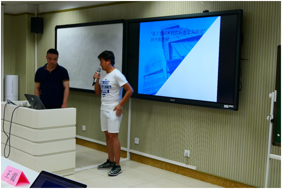 第三组上台答辩的是刘壮壮小组,选题为“基于废旧木材的折叠家具建造”。该组主要利用工业中心的大量废旧木材,针对交大学生群体,对校园空间进行合理的规划与设计及,建造可供学生学习、休闲、娱乐的舒适实用的折叠家具,如桌椅之类,将废弃材料转化为实用的、具有美学性的作品。目前,该组已完成了文献查阅、材料分析和实地勘察等前期准备,并拿出出了较为完善的设计方案。随后,老师们就该组的方案在结构、美学等方面进行了提问。