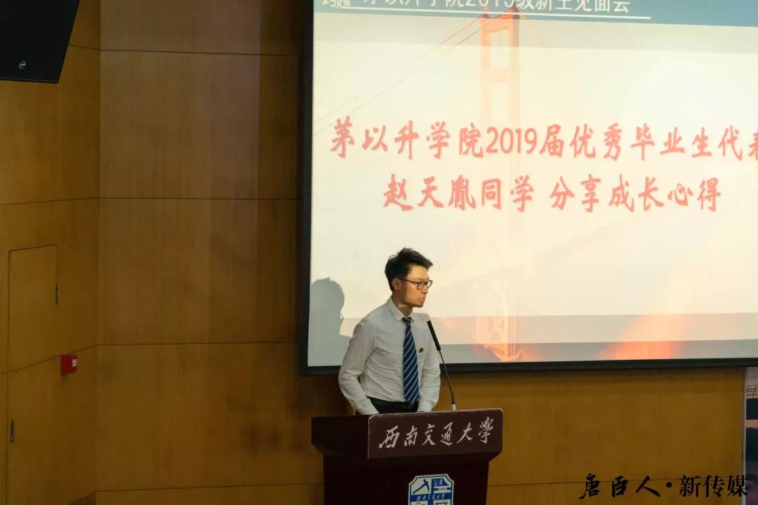 2019届优秀毕业生代表赵天胤同学用精彩的语言,向新生们分享了自己在茅院成长的“独家秘笈”。他以亲身经历讲述了大学应该如何充实生活、丰富自我,给学弟学妹们树立了典范。他希望各位同学能够珍惜四年的大学时光,都能拥有属于自己的唐臣记忆。