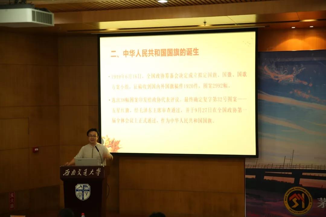 新生讲授第一堂党课——“我和我的祖国——国旗、国徽、国歌专题”。甘书记通过生动形象的图像和影片展示,让同学们更加深刻地认识到,国旗、国徽、国歌是一个国家的标志,更是人民心中的指南针和灯塔。每一个中国人都应当尊重国旗、国徽、国歌,用爱国之情和报国之心去阐释其内容和内涵。