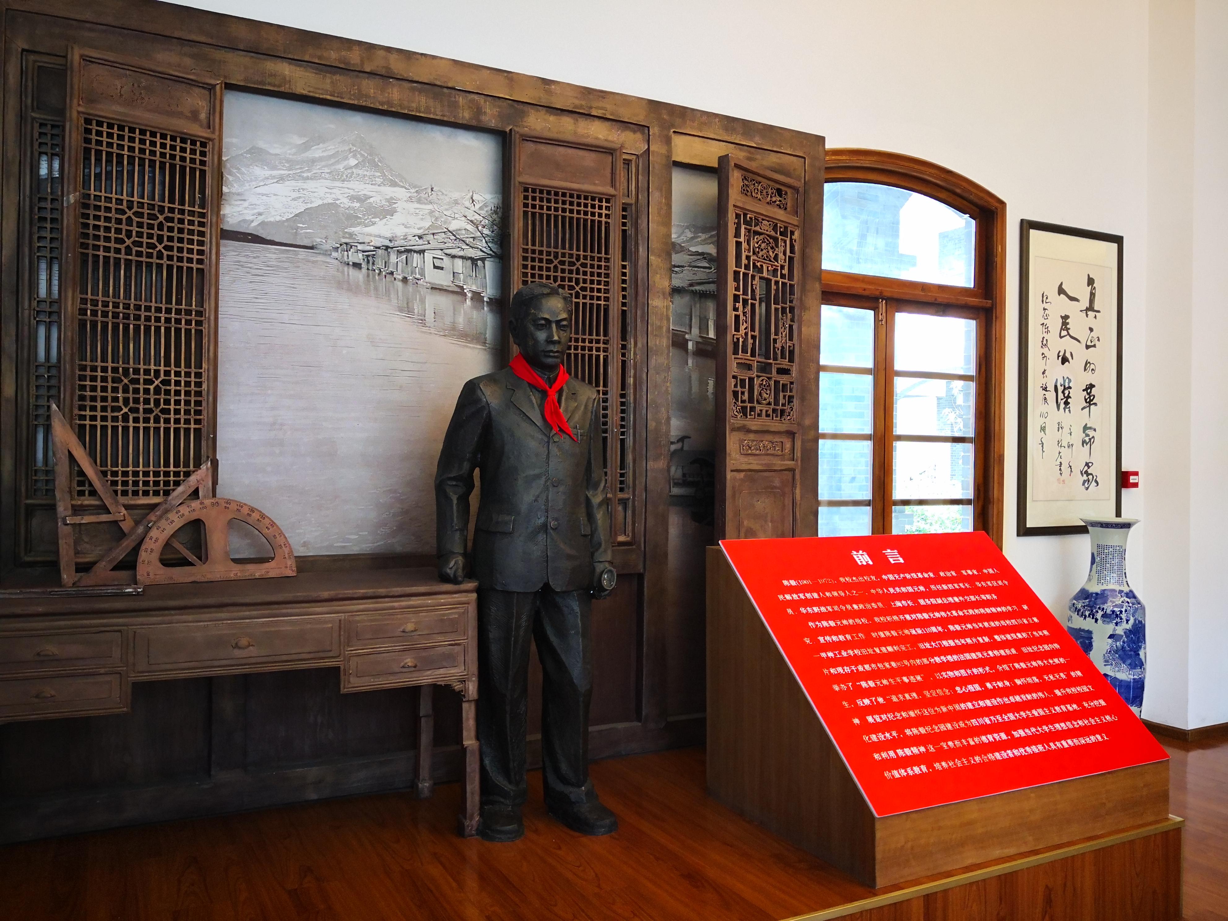 1916年至1918年,陈毅曾就读于四川省立第一甲重工业学校,即今成都工业学院前身。为纪念陈毅元帅,学校建有“四川省立第一甲重工业学校旧址纪念园”(即陈毅纪念园),并于园内设“陈毅生平事迹陈列馆”,以实物和图片的形式,介绍陈毅元帅伟大光辉的一生,反映他“最求真理、坚定信念;忠心报国,勇于献身;胸怀坦荡,无私无畏”的精神,体现了陈毅的自强不息,坚持不懈,坚韧不拔,努力勤奋的良好品质。