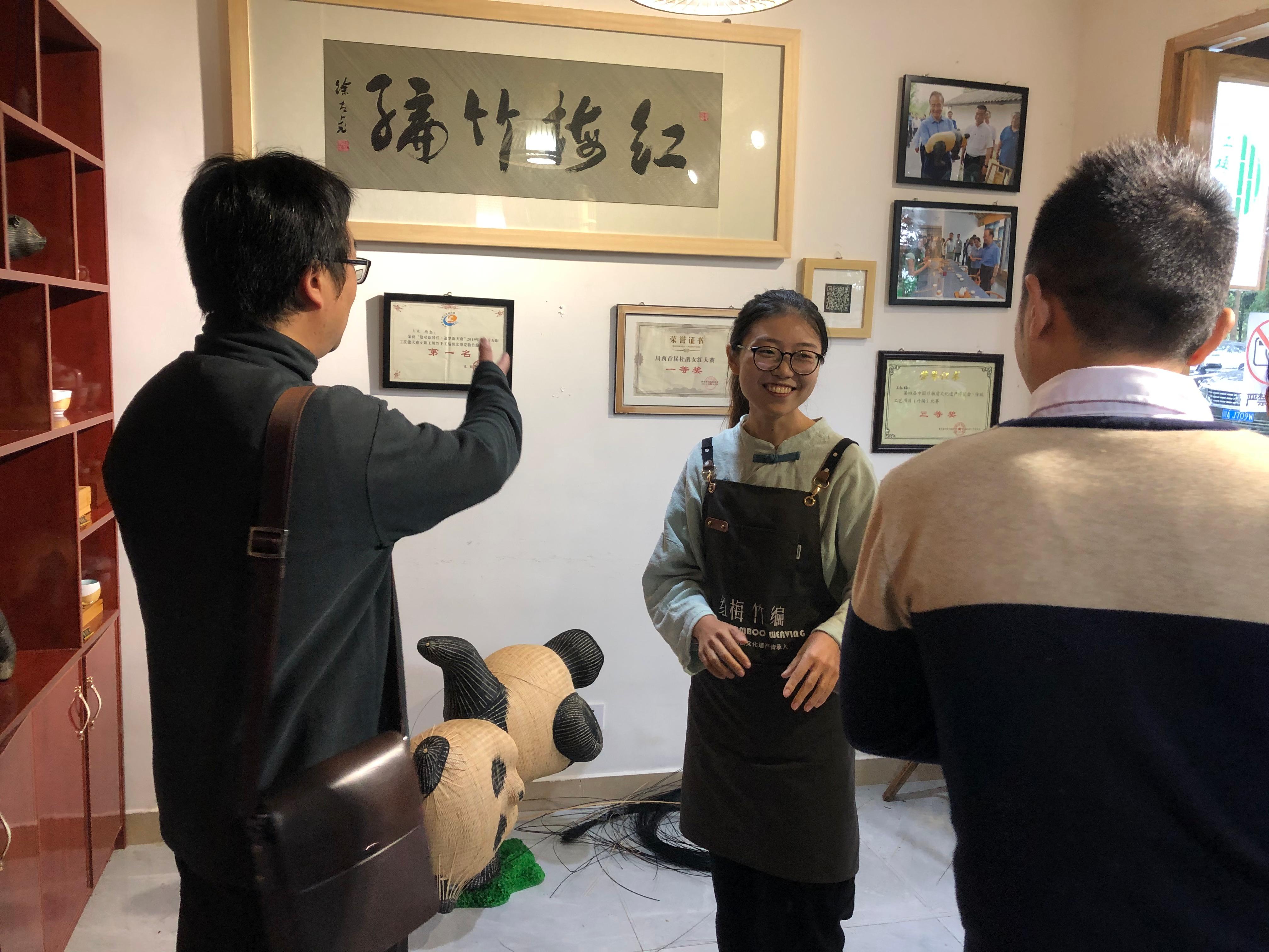 在红梅竹编工作室,甘霖书记与竹编艺术非遗传承人王红梅的女儿——90后女孩肖遥进行了交谈,据她介绍,母亲王红梅是是道明镇土生土长的竹编艺人。上世纪90年代中期,由于现代化工业的发展,道明竹编逐渐萧条,但她始终没有放弃,反而多方学习,探索竹编技艺。正是因为这份坚持,后来也迎来了转机。2018年,她开起红梅竹编工作室,不仅批发和销售道明竹编,更培训了很多留守妇女,促进她们发挥自己的劳动力,带动村民的就业。如今,红梅竹编工作室成为道明镇竹艺村的竹编体验小店,目前每个月营业额在3万左右。