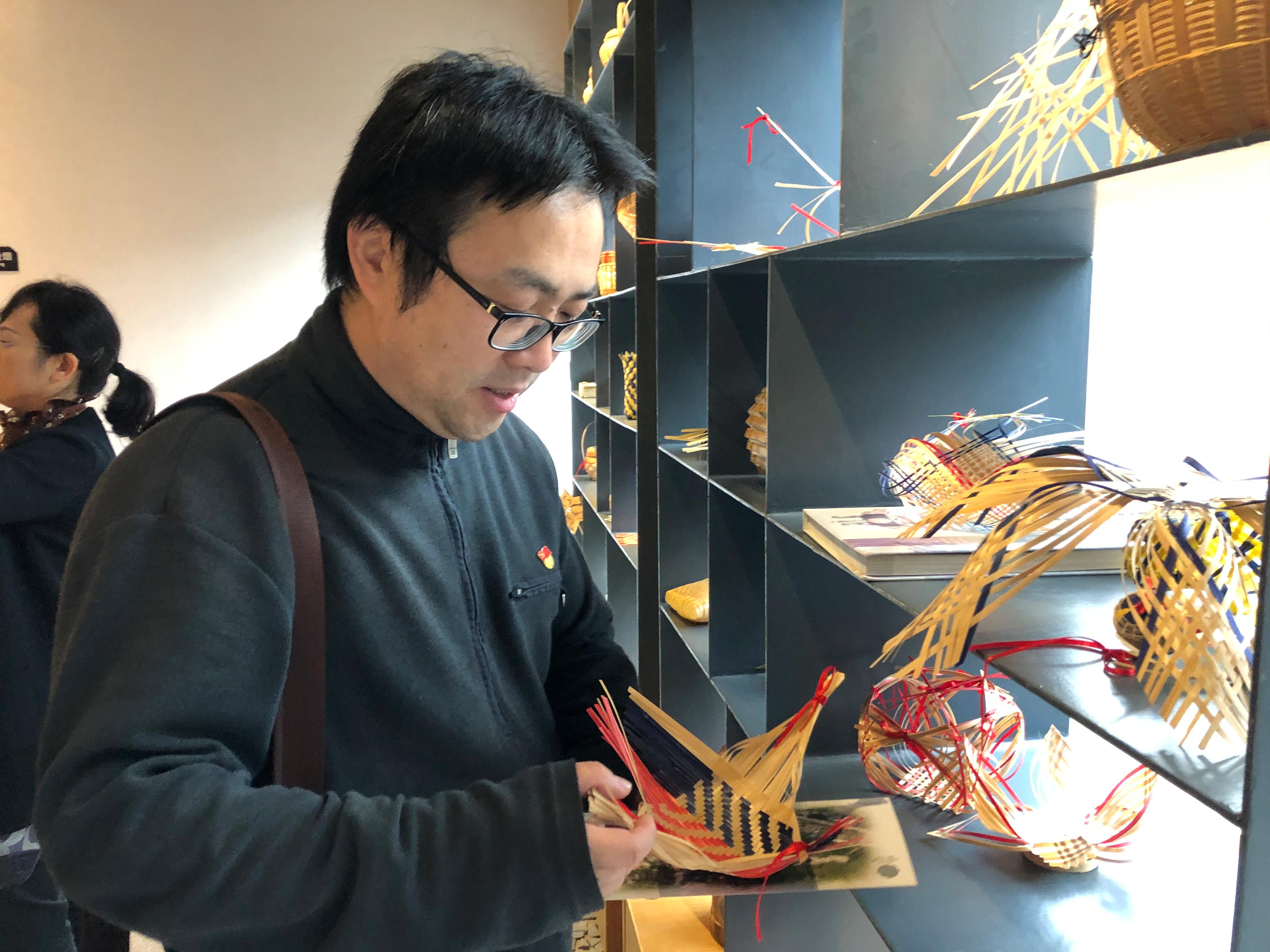在丁知竹竹编文化博览厅,大家鉴赏了精美的竹编艺术及各式各样的竹编产品。有筲箕、果盘等简单的小型生活器具,有竹编字画、摆件等精美的居家装饰品,有轿子、龙船等大型竹编展览品,还有灯具、钟表等竹编新产品。高攀向大家介绍,“丁知竹”竹艺馆于2013年,由“道明竹编”传承人丁春梅及其父亲——道明镇注明竹编传承人丁志云一同创办,同年,“丁知竹”与中央美院城市设计学院家居产品系合作,为学生提供传统竹编研究实习基地。师生们从艺术角度提出的思路,与专业竹编技艺相碰撞,也为“丁知竹”产品创新,提供了灵感的来源和宽广的视野。