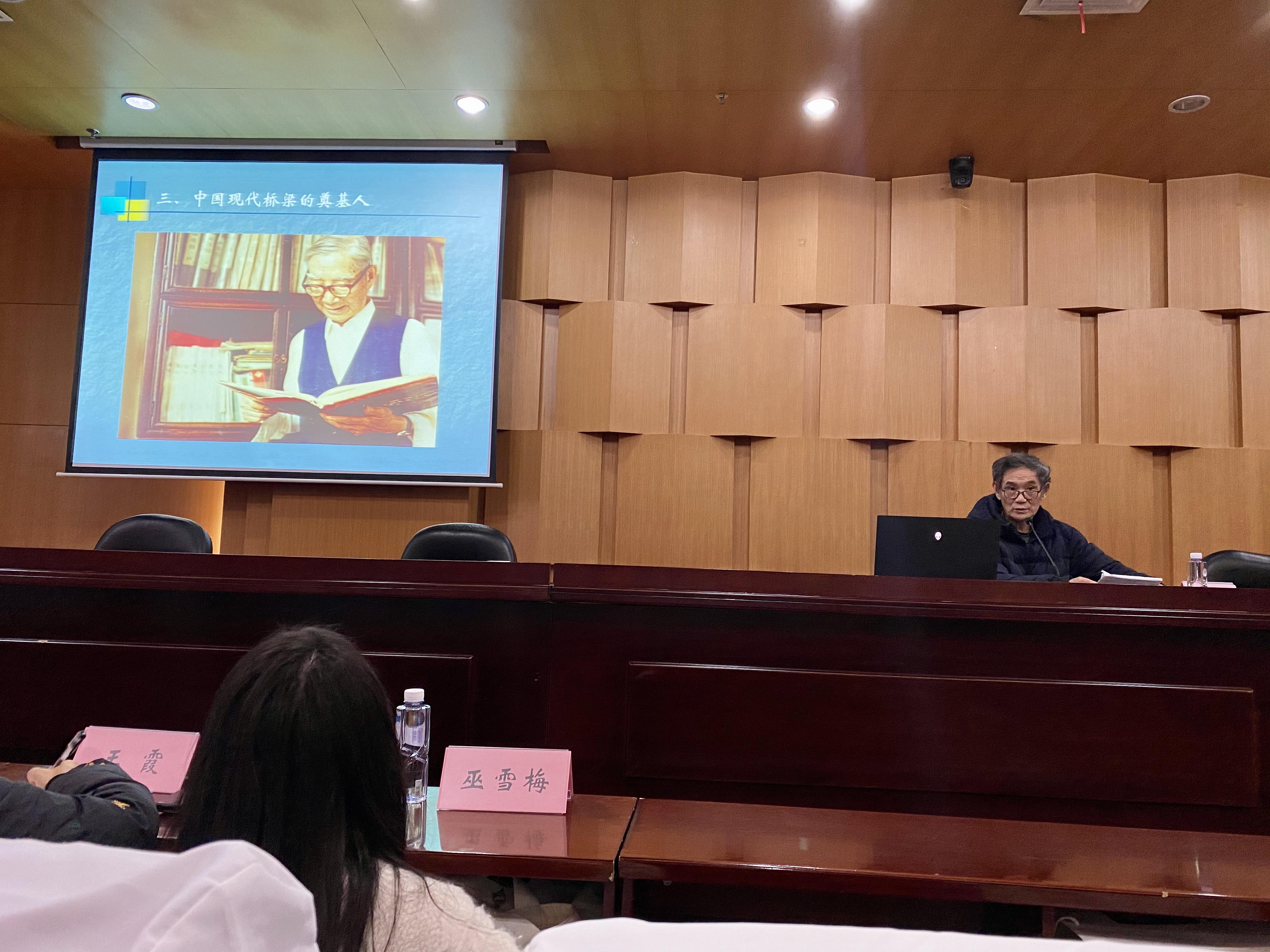 之后,梁教授讲述了茅以升作为一个社会活动家的事迹。上世纪五十、六十年代,茅以升多次率团出访法国、捷克等国家,增进了中国人民同其他国家人民的友谊。此外,茅以升曾先后担任九三学社副主席、中国土木工程协会会长。另外,梁教授展示了茅以升与华罗庚、费孝通、周培源等人物合影的老照片。梁教授还展示了茅以升老校长逝世后江泽民为茅以升送行的照片,以及中国邮政出版的印着茅以升头像的邮票等等。最后,梁教授以一首诗结尾:
