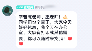 辅导员们所坚守的并不仅仅是那彻夜的陪伴,更是对大家情绪的安抚,以及对大家疫情期间所需所求的努力满足,让他们在这个疫情肆虐、寒风凛冽的季节感受到来自辅导员们的关心与温暖。