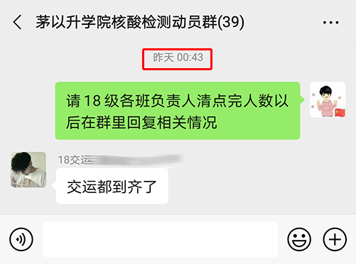 辅导员们提醒各班班长 ,一定要通知到班级所有成员参加核酸检测,坚持不落下任何一个人,做到所有茅院学子应检尽检。