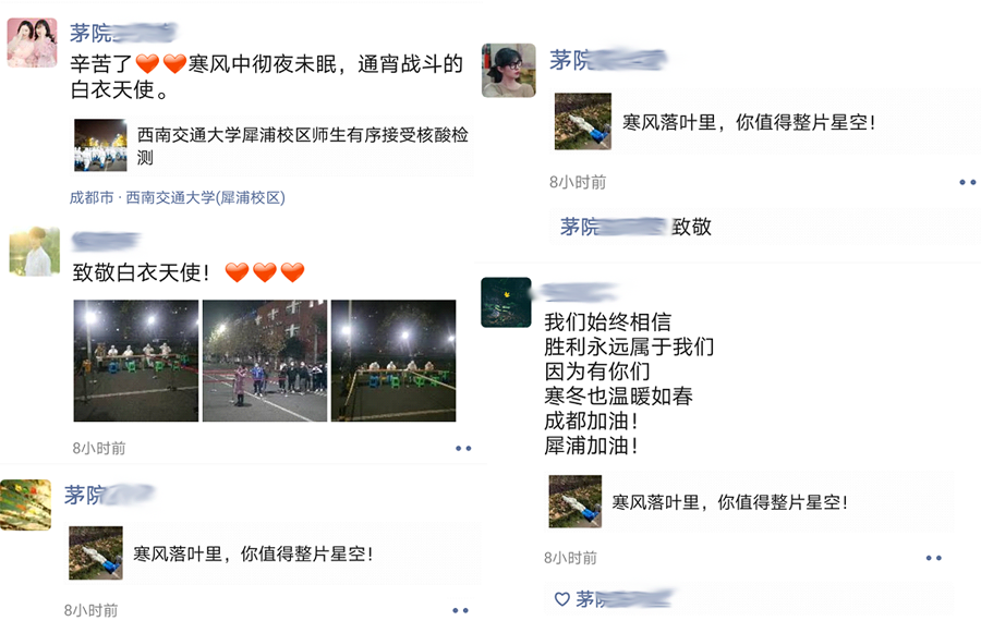 同学的QQ群和朋友圈里,也洋溢着对医护人员以及学校老师的感谢。