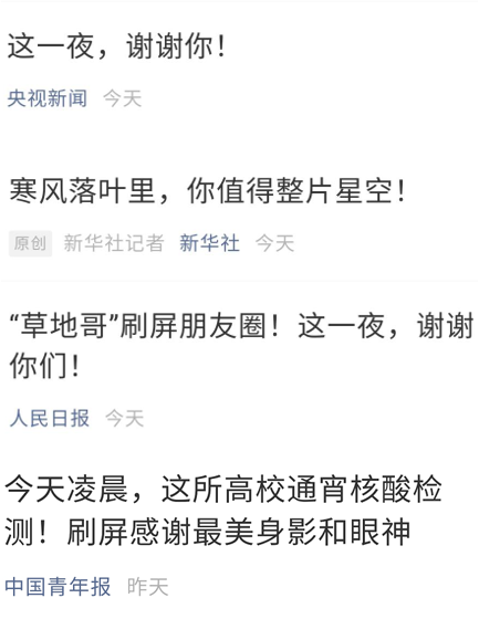 通宵核酸检测,不仅仅在同学们的朋友圈以及QQ空间里带来影响,也被全国媒体所报道,全国人民所关注。