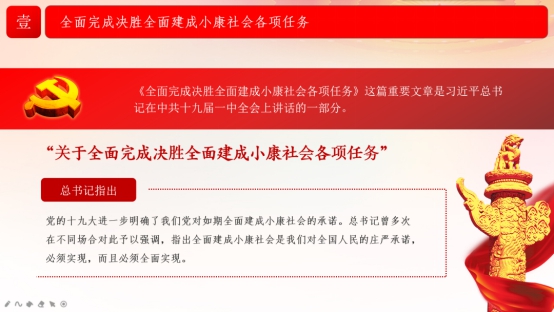 第一部分是全面完成决胜全面建成小康社会各项任务。王欣同学引用总书记的话指出全面建成小康社会是我们对全国人民的庄严承诺,必须实现,而且必须全面实现。之后,王欣同学分别从时间、要求、任务三个方面举例说明,给同学们留下了深刻的印象。
