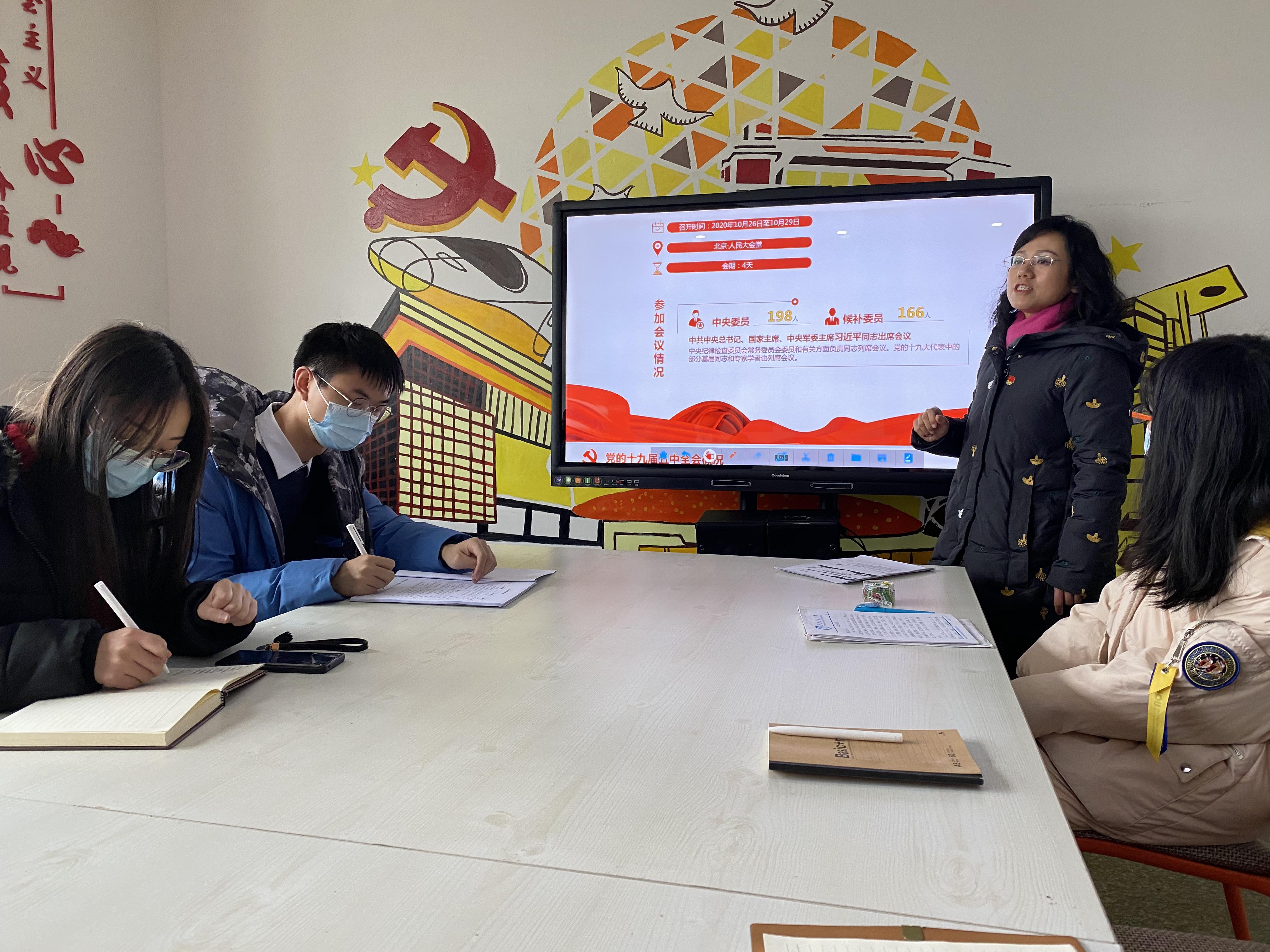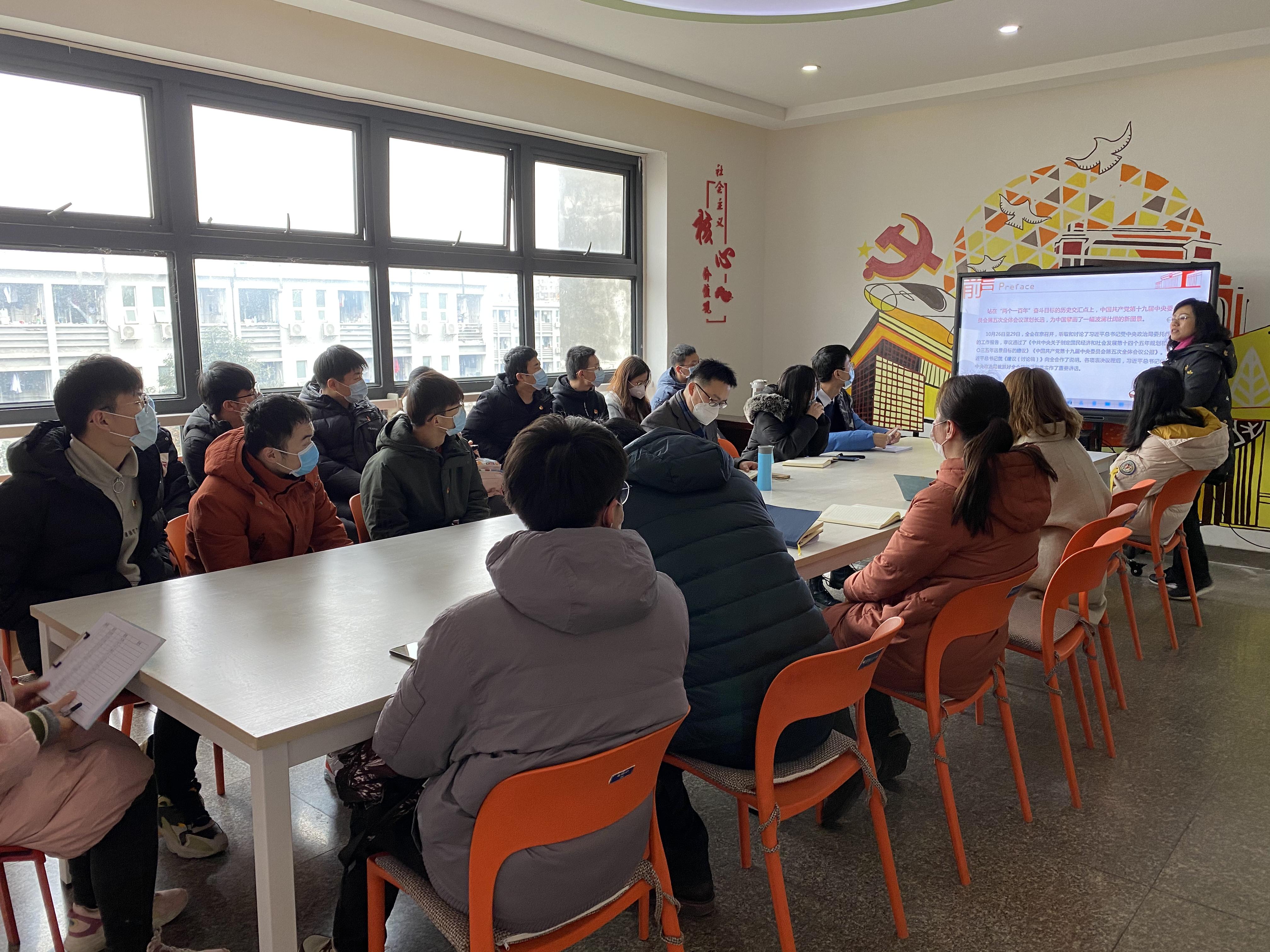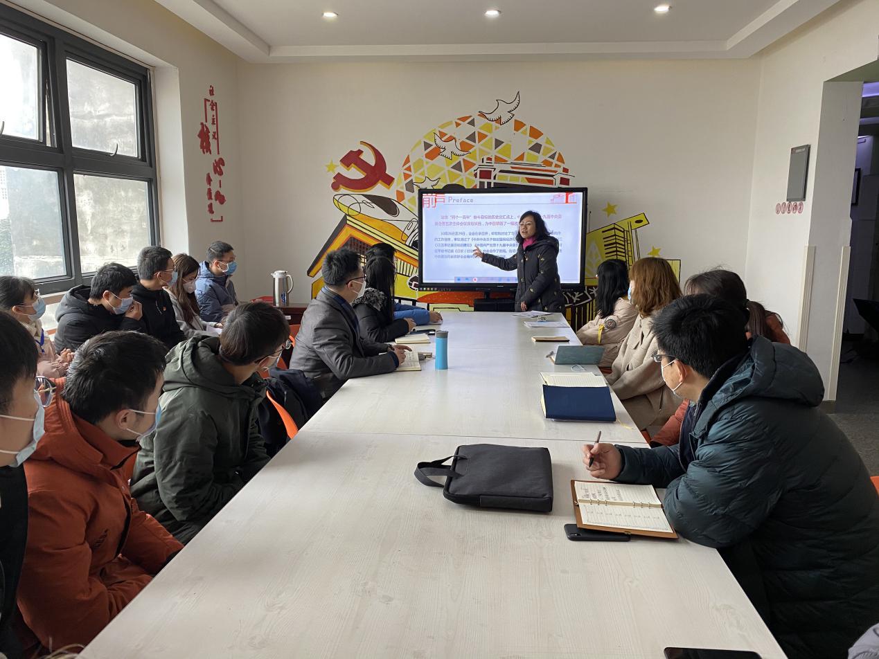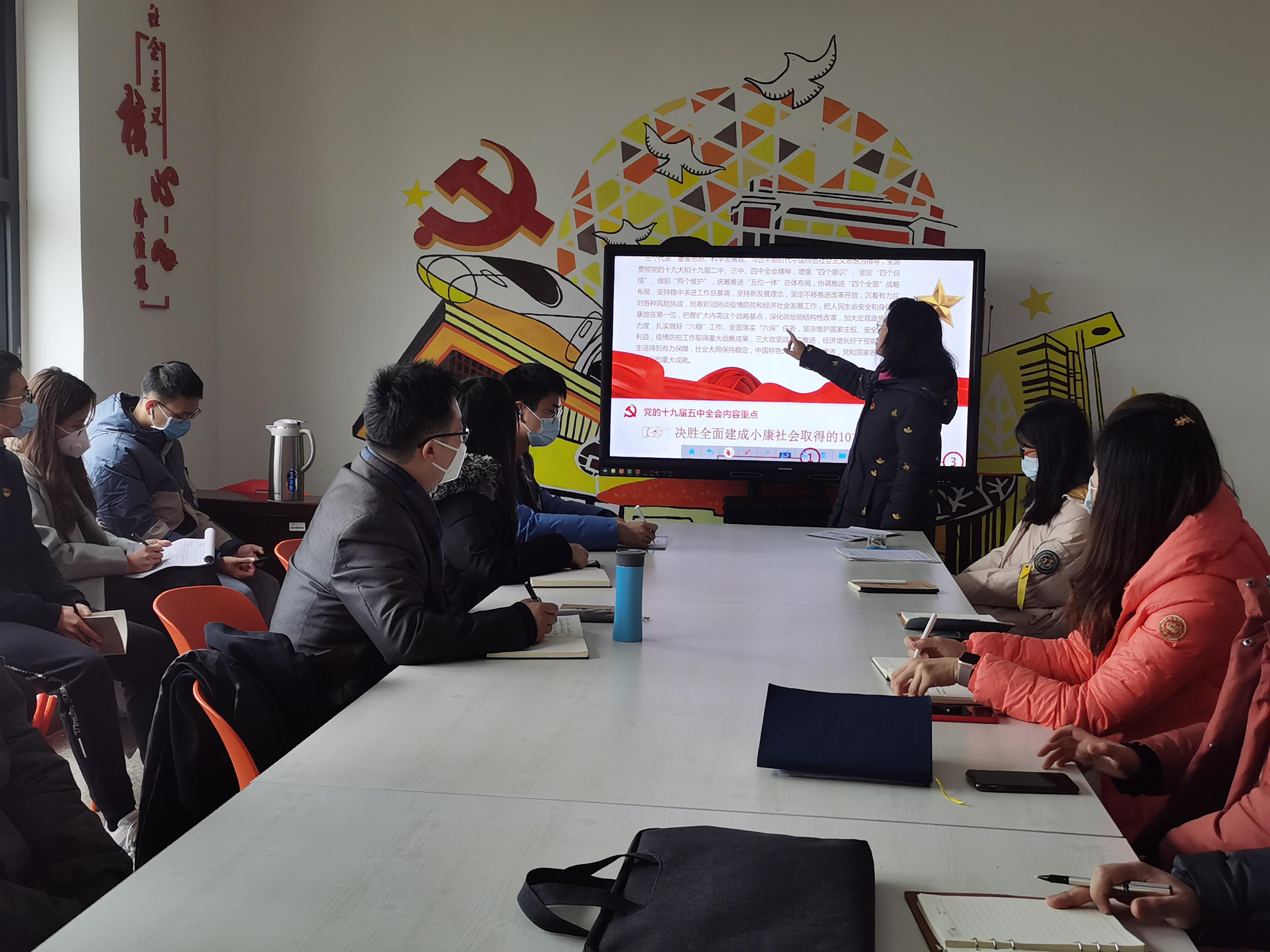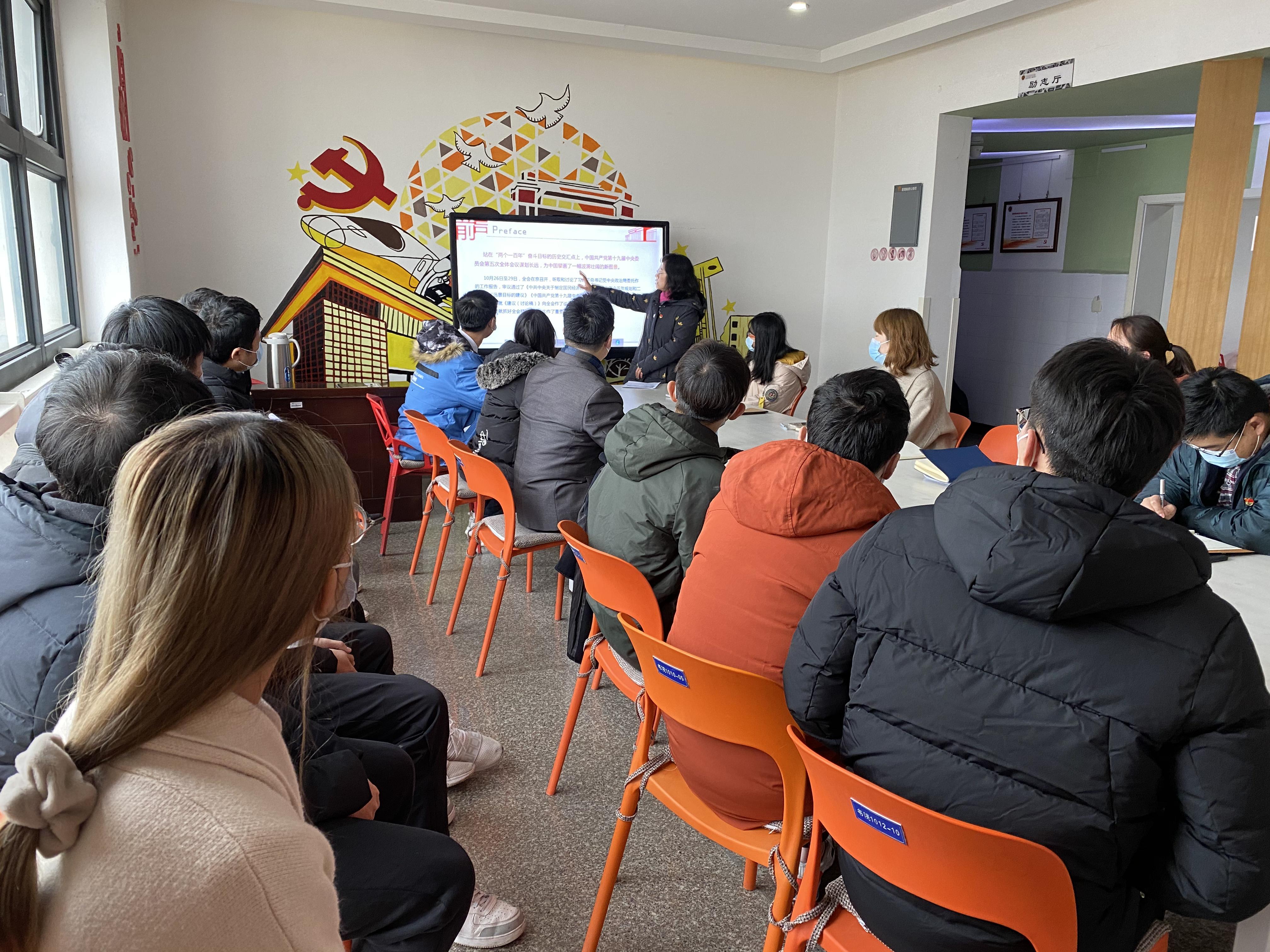 六楼“励志厅”开展了“深入学习贯彻党的十九届五中全会精神,全面学习解读公报内容”的党课活动。党课由王霞副书记主讲。