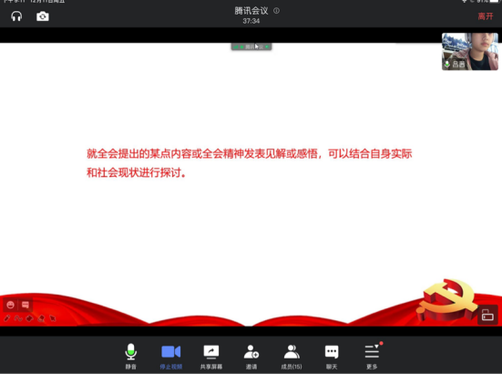 最后,团支部成员就全会提出的某点内容或全会精神,结合自身实际和社会现状发表了自己的见解和感悟。其中,林红利同学围绕本次会议,对我国“十四五”时期处于重要战略机遇期的新特征进行讨论。吕茜同学发表了自己对于党的十九届五中全会所提出的指导思想与重要原则的认识和见解。
