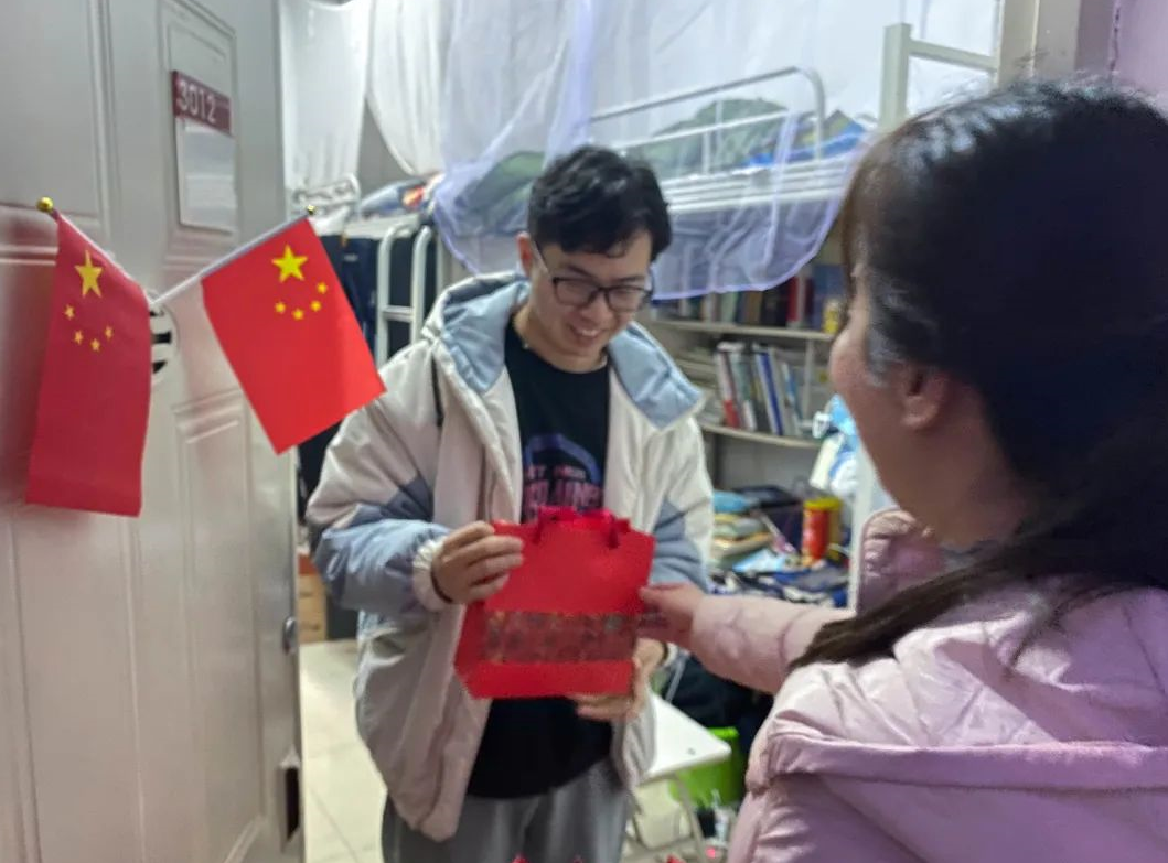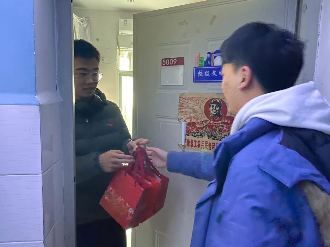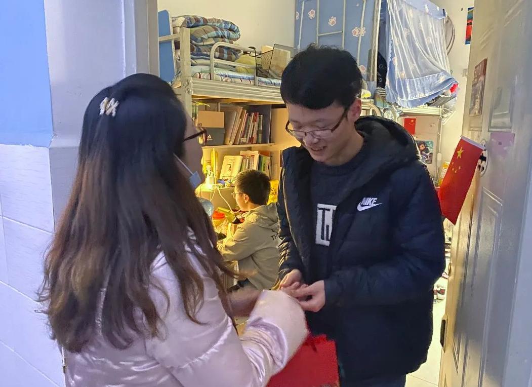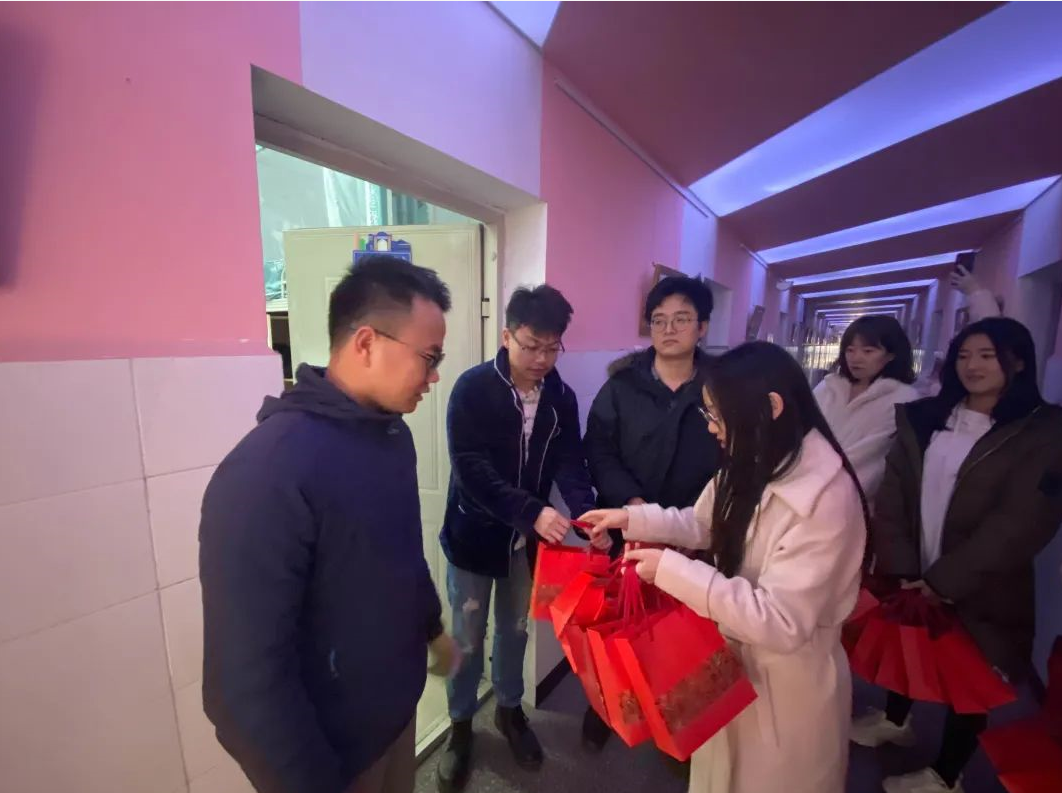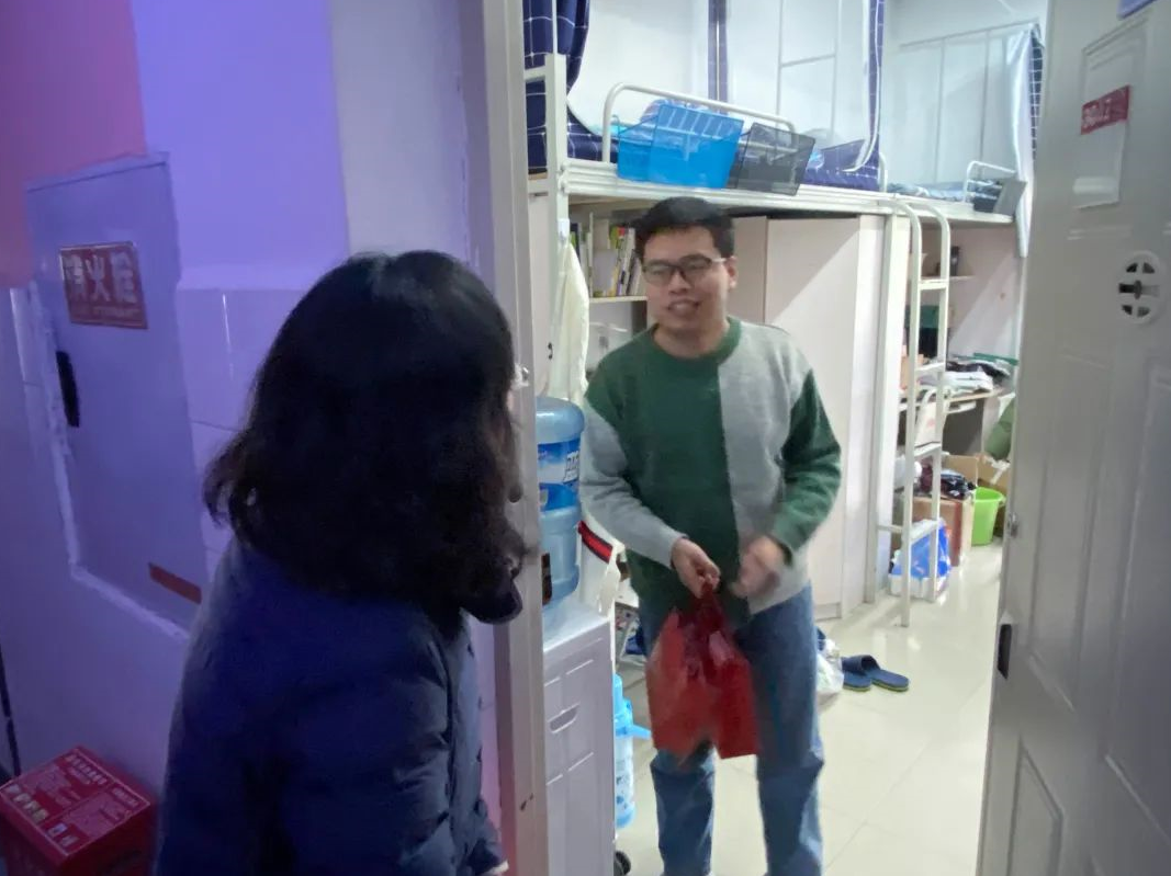 为了不影响书院同学们的正常休息,老师们放轻脚步,轻声叩响了第一位考研同学寝室的门。同学们一打开门,便收到了离门最近的甘霖老师早早为考研同学准备好的暖心加油礼包,惊喜和感动溢于言表,连忙向老师们一一致谢,活动现场气氛活跃。全体老师们还送上了自己的殷切祝愿,希望同学们无论是在考研还是在之后的考试中都能锦鲤附身,牛气冲天,取得佳绩。在这个寒冷的冬日,一声声问候实实在在地温暖了唐臣学子的心。