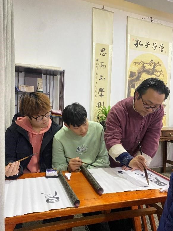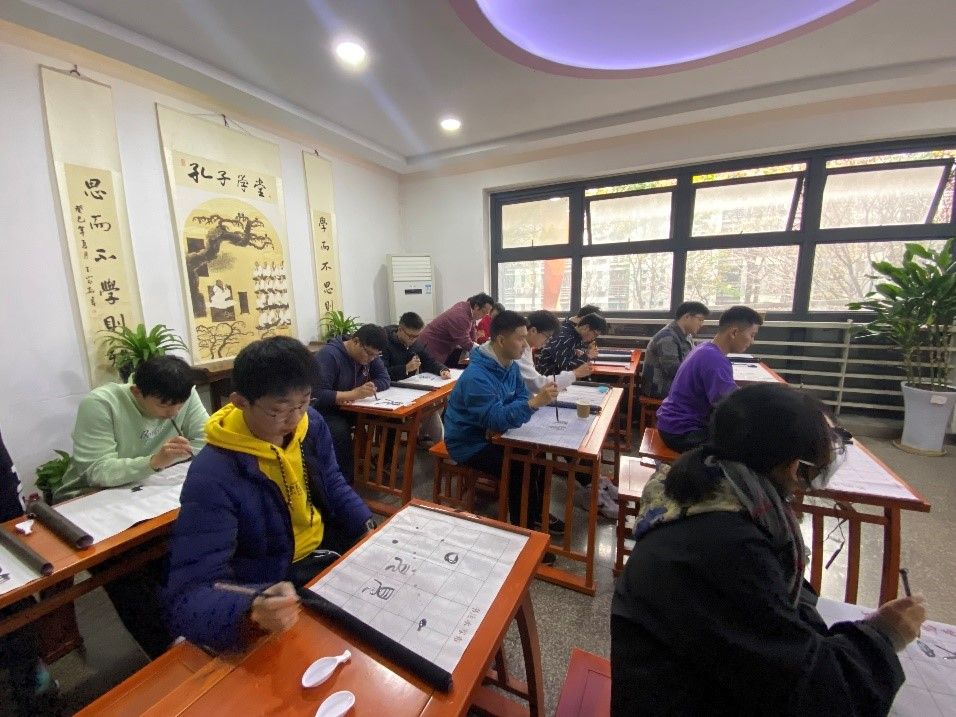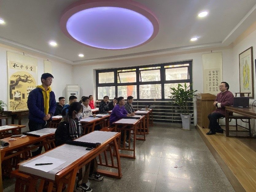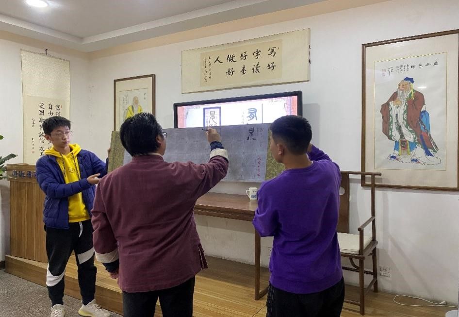 了解了书法的基本知识后,甘老师给同学们介绍了书法的执笔、姿势、笔法,欣赏书法佳作名篇,赏析书法的线条、结构、质感、形态之美。甘老师还为同学们一一示范、指导如何书写篆、隶、楷、行等书体,感受汉字与书法的魅力,提升国学文化素养,激发学生们热爱传统文化、学习书法艺术的热情,特别强调练字就是炼心、修身,写好字更要做好人。