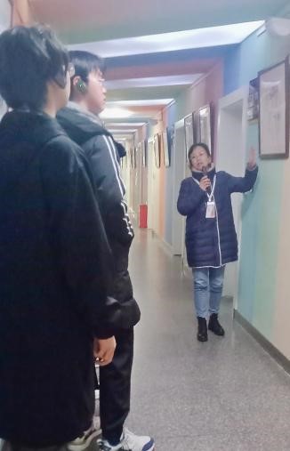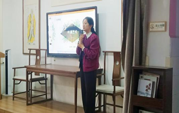 到了二楼“国学走廊”,在“孔子学堂”内,孟涵老师介绍了孔子学堂的主要用途及曾经举办的一些国学传习、传统礼仪活动。同时给大家带来了高雅生动的吟诵艺术体验教学。欣赏了撒贝宁吟诵的《月夜忆舍弟》、吟诵经典《相和歌》,讲解了“平长仄短”“平直仄曲”等吟诵规律,带领大家一同吟诵了一曲《春晓》。