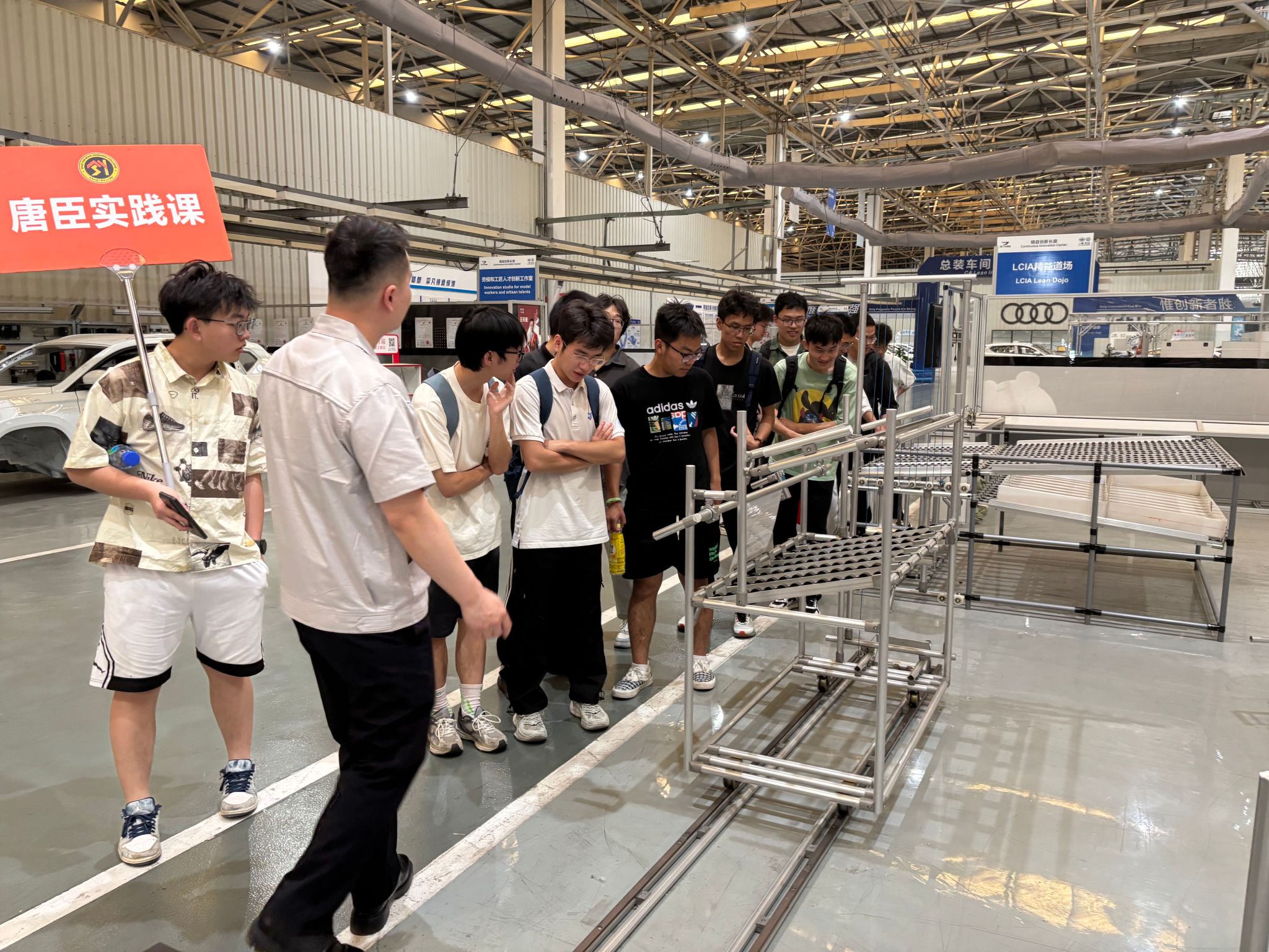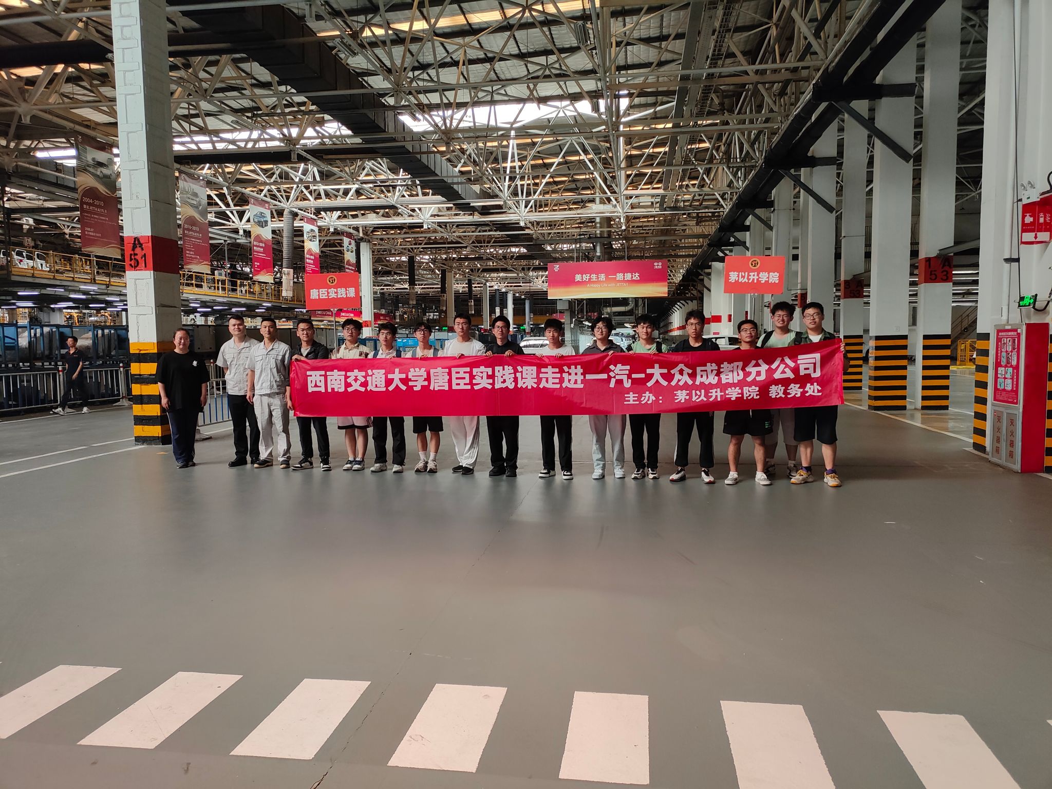 一汽-大众成都分公司总装车间校企合作负责人江济炜、总装工长兼研学研修负责人李屹伟引领同学们深度探访捷达工厂,在捷达大楼、焊装车间、总装车间、精益长廊,零距离了解一辆汽车从组件、安装到检测的诞生全过程,沉浸式感受智能制造的魅力。同学们在生产现场听取了关于生产全要素数字化管理系统现状、问题及其改进方法的介绍。