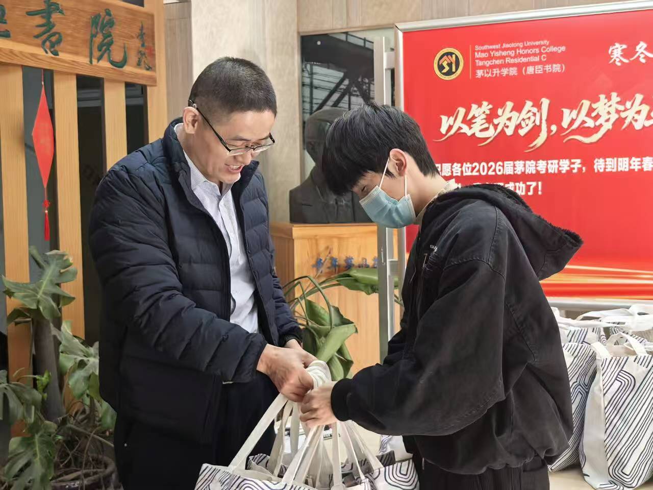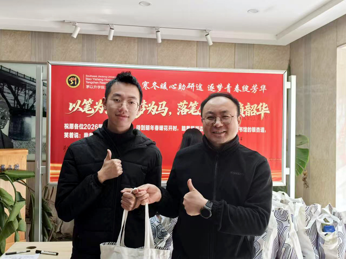 活动现场暖意融融,学院领导与老师们亲手将慰问礼包递到每一位考研学子手中。礼包上印有的交大诞辰年份“1896”特色纹样,既彰显着百年学府的深厚底蕴,更承载着学院对学子的殷切期许。礼包内的备考物资精准契合考研学子的需求,每一份物品都饱含着学院的细致关怀,凝聚着助力冲刺的满满能量。李毅书记在现场与学子们亲切攀谈,细致询问大家的复习进度、攻坚难点与心理状态,叮嘱大家合理规划作息、科学调整心态,以饱满的精神状态和稳健的身心状态从容迎战研考。学子们接过这份沉甸甸的“暖心礼包”,脸上洋溢着感动的笑容,纷纷表示:“这份关怀让我们倍感温暖,也让我们更有底气!我们一定会把这份鼓励转化为冲刺的动力,在考场上沉着应战、全力以赴,不辜负学院的期许,更不辜负自己的日夜坚守。”