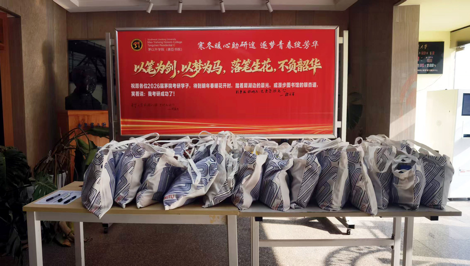 此次“考研加油站”慰问活动圆满落幕。红色主题寄语墙承载着师生们的祝福与期许,一份份兼具心意与实用的“考研加油包”,既是学院为学子们送上的物质补给,更是一份沉甸甸的精神支撑。手握礼包的考研学子们,真切感受到了来自学院与老师们的满满温情,这份温暖已然化为冲刺备考路上的强劲底气,让他们在逐梦征程上的脚步更加坚定有力。相信带着这份关怀与力量,茅院2026届考研学子们定能在研考战场上披荆斩棘、不负韶华,书写青春华章!