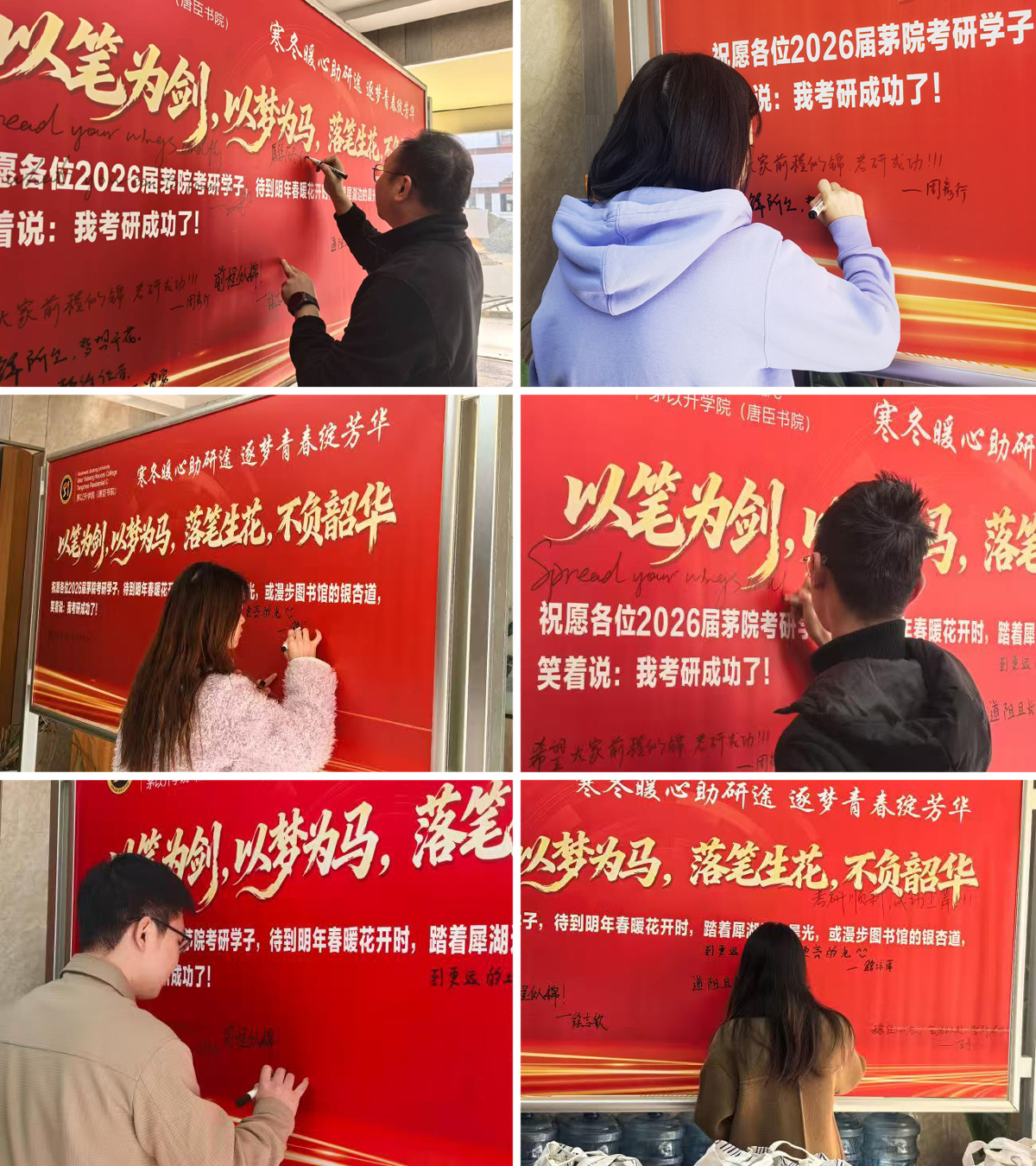 现场,一面印着“以笔为剑,以梦为马,落笔生花,不负韶华”的红色主题寄语墙格外醒目,成为整场活动的暖心亮点。学院老师们与同学们纷纷驻足,在寄语墙上挥笔写下真挚的祝福与期许,为冲刺考研的学子们凝聚起同心奋进的精神力量。杨宏毅老师写下“愿你历尽千帆,得偿所愿,金榜题名!”的深切祝福;王丹老师留下“稳住心态,全力以赴,考研必胜!”的铿锵鼓励;雷雳老师笔下的“愿笔锋所至,梦想开花,考研加油,静待佳音!”的字迹温暖真挚;路萍萍老师亦提笔写下“到更远的地方,见更亮的光!”的美好期许。一句句暖心寄语、一行行真挚祝福,让学子们在文字的暖意中汲取奋进力量,更加坚定了冲刺研考的决心。